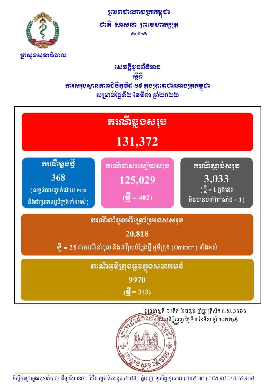 Cambodia reports 368 new cases of the novel coronavirus (PCR Confirmed) and 1 death, announced by the Ministry of Health this morning.