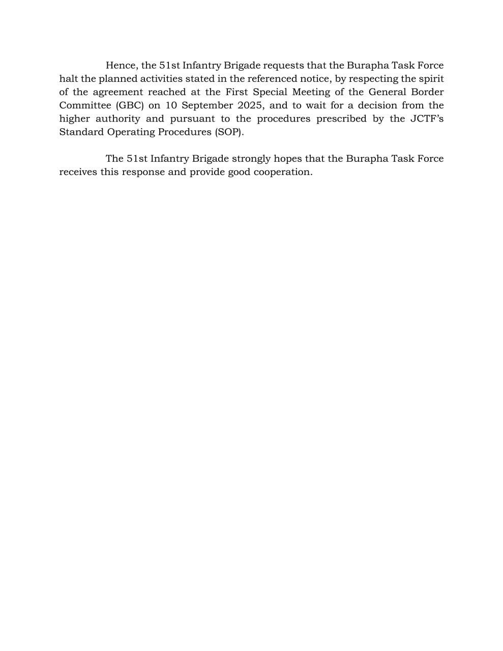 Therefore, the 51st Infantry Brigade formally requested the Burapha Task Force to halt all planned activities mentioned in its notice No. 0481.2/602 dated 8 October 2025, and to await further instruction from higher authorities in line with the JCTF’s Standard Operating Procedures.
