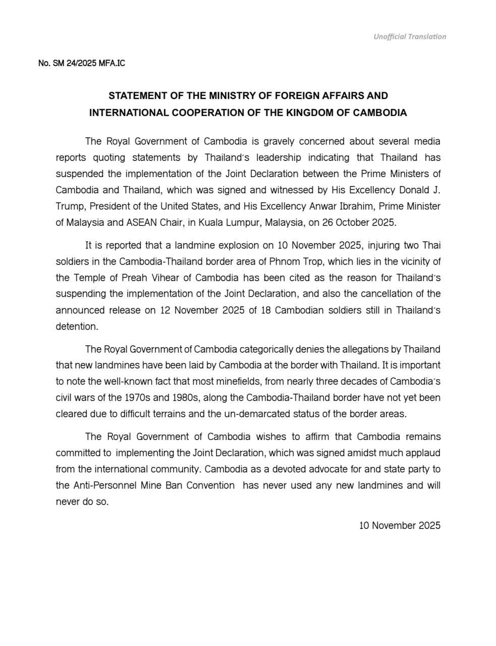 Phnom Penh, November 11, 2025 — The Royal Government of Cambodia has expressed grave concern following reports quoting statements from Thailand’s leadership indicating that Bangkok has suspended the implementation of the Joint Declaration between the Prime Ministers of Cambodia and Thailand, signed on October 26, 2025, in Kuala Lumpur, Malaysia, and witnessed by U.S. President Donald J. Trump and Malaysian Prime Minister Anwar Ibrahim, in his capacity as ASEAN Chair.