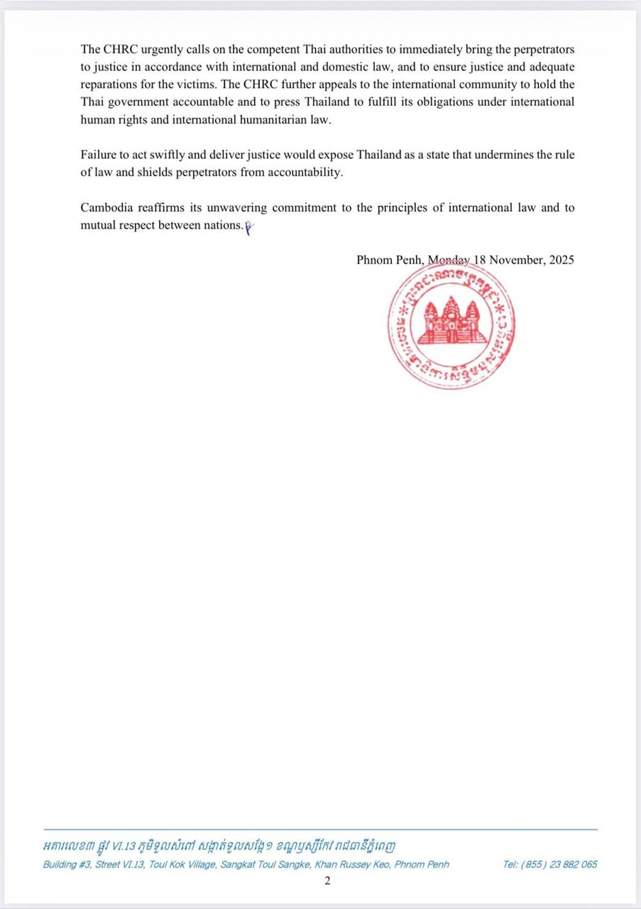 The CHRC further condemned the 12 November 2025 attack in which Thai soldiers carried out an unprovoked assault against innocent Cambodian civilians, resulting in deaths, injuries, and the forced displacement of hundreds of families in the middle of the night.