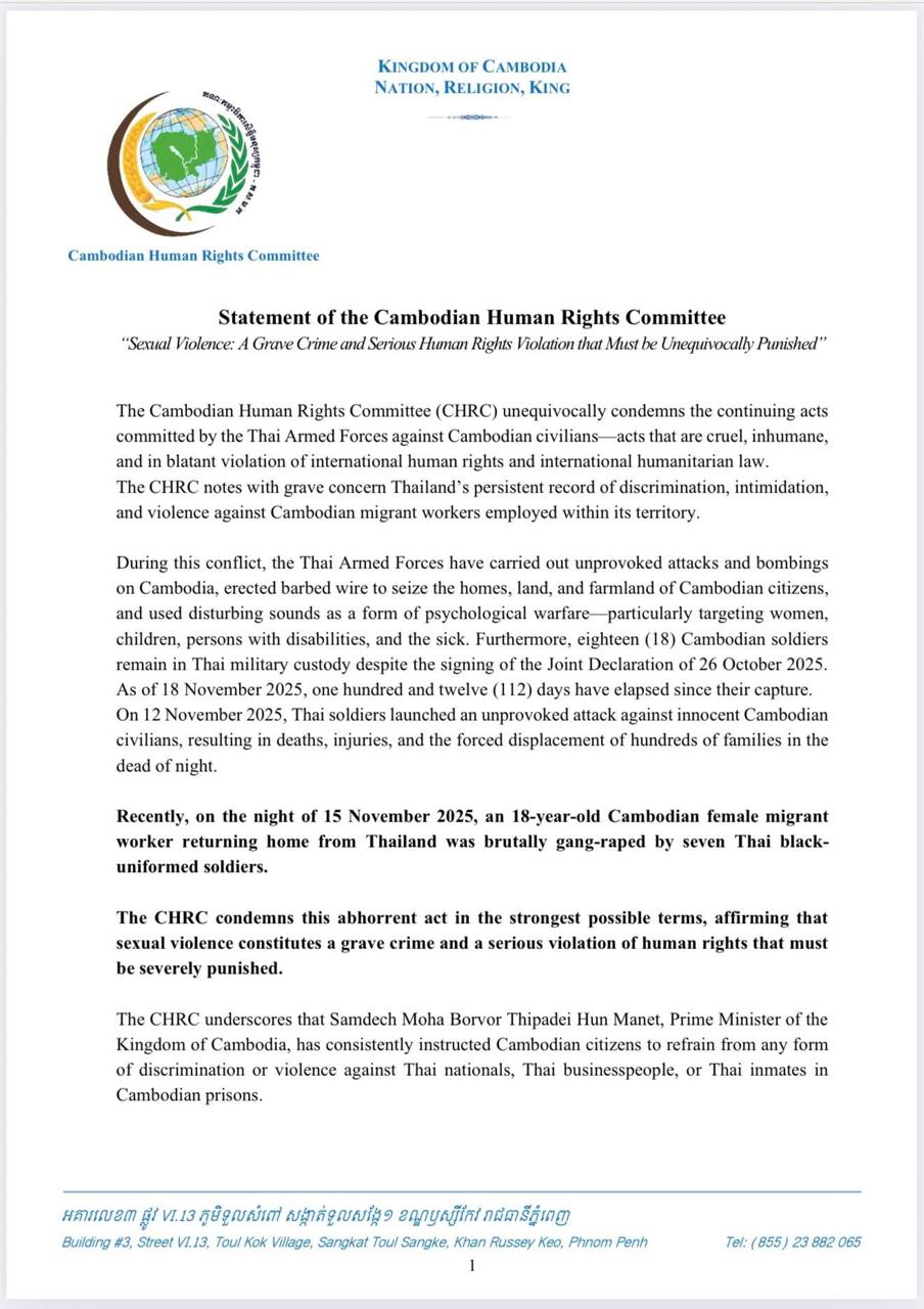 Phnom Penh, 18 November 2025 — The Cambodian Human Rights Committee (CHRC) has issued a forceful statement condemning the continuing acts of brutality and serious human rights violations committed by the Thai Armed Forces against Cambodian civilians and migrant workers. The Committee denounced these actions as cruel, inhumane, and in clear violation of international human rights and humanitarian law.