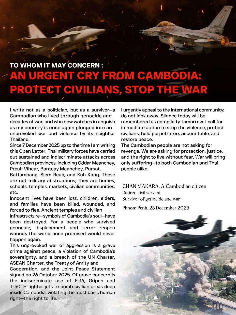 Since 7 December 2025 up to the time I am writing this Open Letter, Thai military forces have carried out sustained and indiscriminate attacks across Cambodian provinces, including Oddar Meanchey, Preah Vihear, Banteay Meanchey, Pursat, Battambang, Siem Reap, and Koh Kong. These are not military abstractions; they are homes, schools, temples, markets, civilian communities. etc.