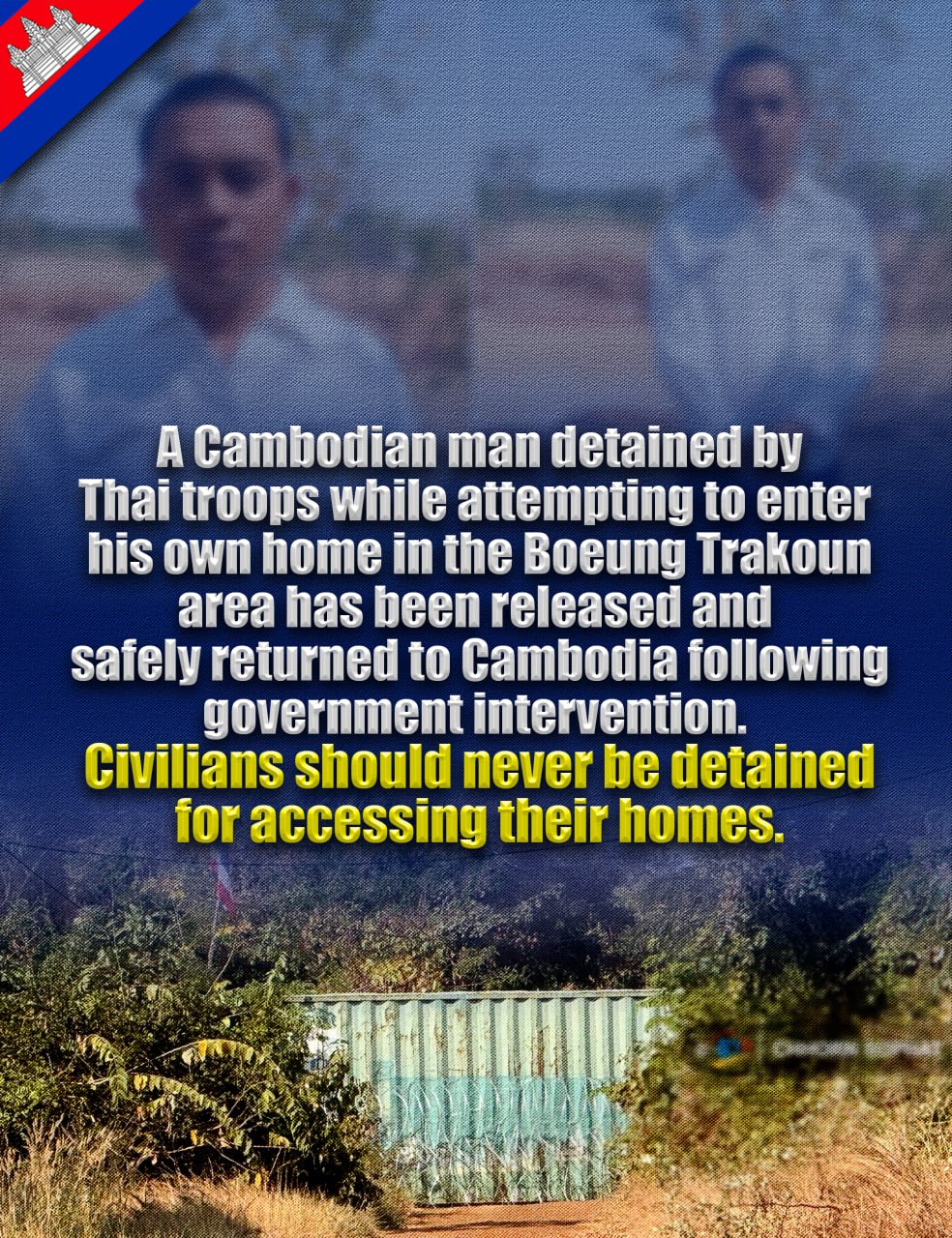A Cambodian man detained by Thai troops while attempting to enter his own home in the Boeung Trakoun area has been released and safely returned to Cambodia following government intervention. Civilians should never be detained for accessing their homes