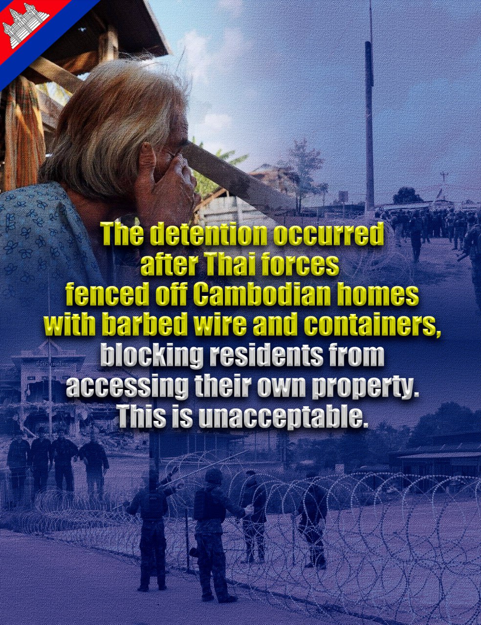 2. The detention occurred after Thai forces fenced off Cambodian homes with barbed wire and containers, blocking residents from accessing their own property. This is unacceptable.